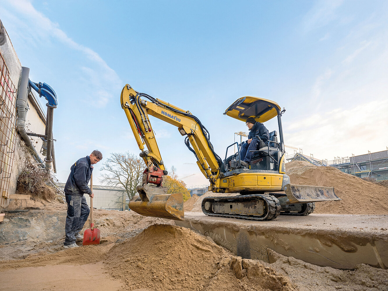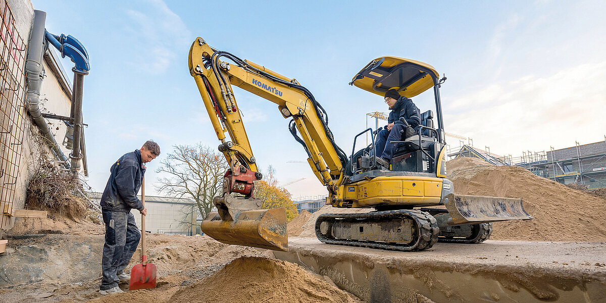 Neben dem modernen Maschinenpark hat Ole besonders die Größe des Unternehmens mit mehr als 125 Mitarbeitenden überzeugt: „Ich wollte in einem Betrieb arbeiten, wo immer etwas los ist und man verschiedenste Projekte kennenlernt. Welche das sind, habe ich erst nach und nach entdeckt – und auch, wie viel Spaß das macht!“ Schon am ersten Tag wird der 17-Jährige nach einem netten Empfang im Unternehmen auf einer Baustelle eingesetzt und darf sich unter Anleitung mit Minibagger und Radlader vertraut machen. „Baggerfahren wollte ich schon immer lernen, und es ist genauso cool wie ich dachte“, verrät der Azubi. Dass er zusätzlich zu der „maschinenlastigen“ Arbeit auch körperlich gefordert wird, ist für ihn die perfekte Mischung: „Bei Pflasterarbeiten, dem Setzen von Schächten oder der Verlegung von Leerrohren ist auch etwas Muskelkraft gefragt.“