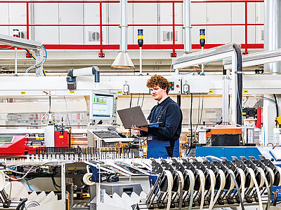 An der Hochschule freut sich der Detmolder über eine enge Betreuung und kleine Kursgrößen, die ein intensives Lernen ermöglichen. Im ersten Praxissemester geht es dann bei nobilia in die „riesige“ Produktion: „Darauf baut alles auf, deshalb sind das wichtige Einblicke.“ In seinem zweiten Praxiseinsatz wird der Studierende direkt mit einem großen Projekt im Werk betraut. „Ich bekam die Aufgabe, mir einen sogenannten ‚Nachhol-Prozess‘ genauer anzusehen“, berichtet er. „Vereinfacht gesagt geht es darum, dass in der Produktion aussortierte Teile schnell wieder da ankommen, wo sie hingehören.“ Dafür analysiert er die dazugehörigen Prozesse, wertet Maschinendaten aus, berechnet mit Hilfe der IT Durchlaufzeiten, stimmt gemeinsam mit Mitarbeitenden der Produktion den Umbau der Elektrik ab, konstruiert Anbauteile etc. „So viel Freiraum und Vertrauen sind nicht selbstverständlich!“, weiß Luis. Fachlich und menschlich hat er dadurch bereits viel gelernt. Gleichzeitig kann er sich jederzeit auf Unterstützung und persönlichen Zuspruch verlassen: „Da kommt wirklich das Familienunternehmen durch!“