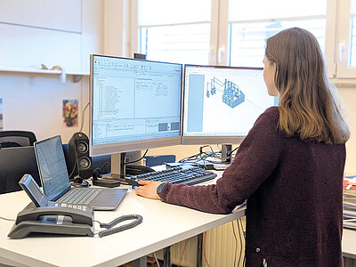 „Bei Schröter habe ich mich direkt wohlgefühlt!“, sagt Laura, die ihre Ausbildung zur Technischen Produktdesignerin bereits abgeschlossen hat. „Die Atmosphäre ist super und du kannst jederzeit alles fragen.“ Bei der Entwicklung von Einzelteilen, die in unterschiedlichsten Anlagen für Kunden in der Region und auf der ganzen Welt zum Einsatz kommen, entdeckt sie ständig neue Herausforderungen. Als Azubi lernst du zunächst die Grundlagen der Metallbearbeitung, das Drehen, Fräsen etc. kennen und bekommst spannende Einblicke in die Produktion, bevor du an die modernen Zeichenprogramme herangeführt wirst. Für Laura war das der perfekte Einstieg: „Du konstruierst ja für den Betrieb – da ist es wichtig, zu verstehen, wie die Teile später gefertigt und genutzt werden.“