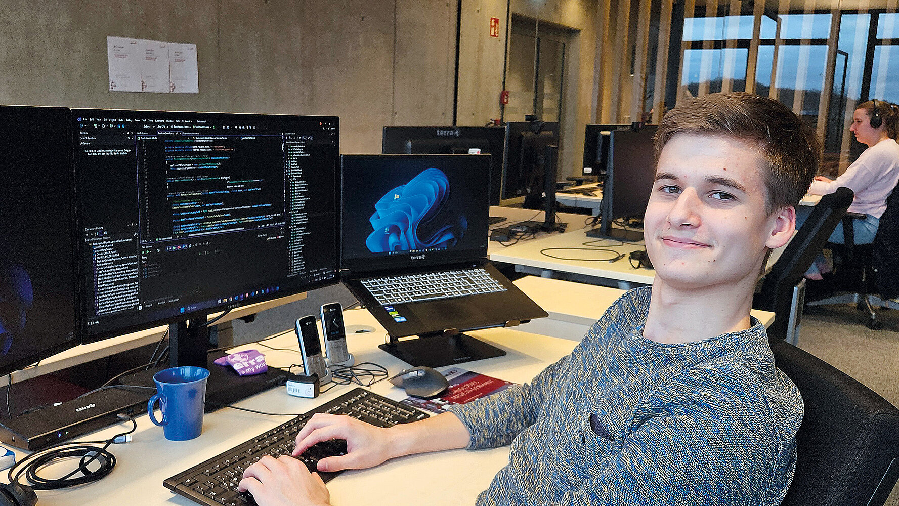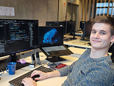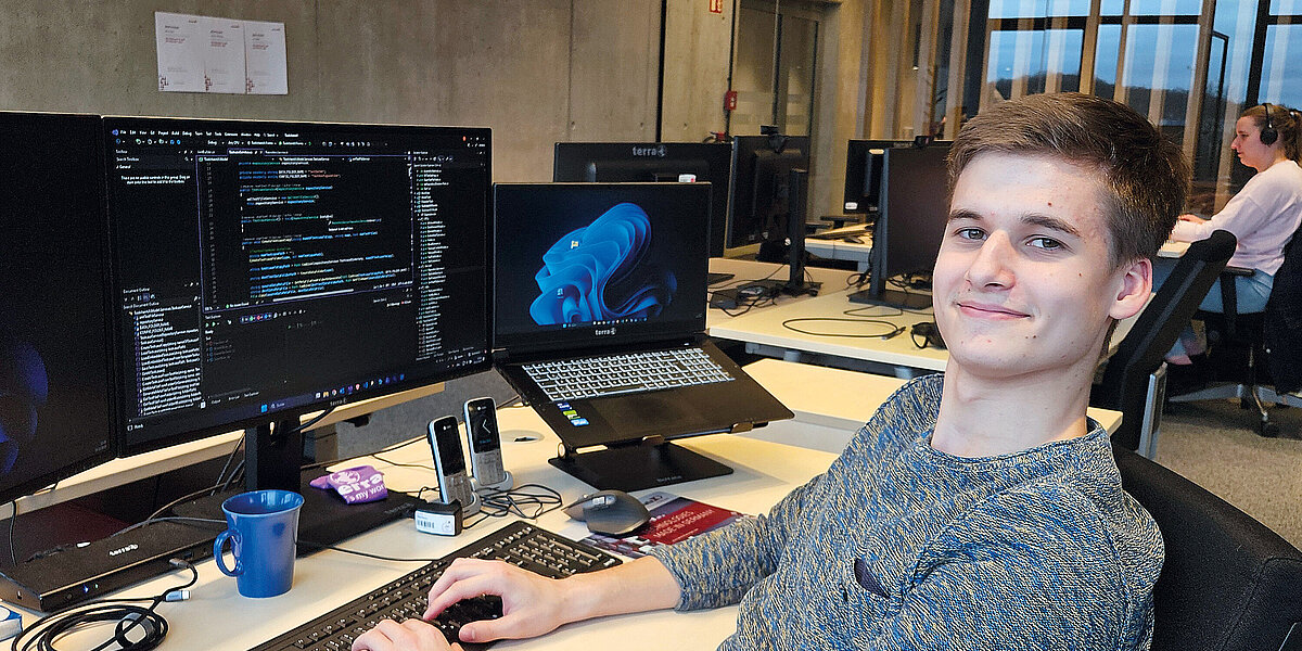 Auch nach Ausbildungsstart geht es für Josef mit viel Praxis und Abwechslung weiter. „Um grundlegend in die Programmierung reinzukommen und Routinen zu entwickeln, habe ich zum Beispiel eine Ameise gebaut, die laufen kann“, berichtet der angehende Anwendungsentwickler. Im voll ausgestatteten Übungsraum arbeitet er an dem Projekt von der Idee über die Zeichnung bis hin zur Fertigstellung sehr selbstständig: „Dazu habe ich Einzelteile mit dem 3D-Drucker erstellt, Elektronikbauteile und Motoren montiert, die Bewegungen der Ameise programmiert und vieles mehr.“ In den verschiedenen Teams rund um die Entwicklung, individuelle Konfiguration und Testung von Software lernt er darüber hinaus die vielfältigen Abläufe kennen und arbeitet an realen Projekten, etwa der eigenständigen Entwicklung eines Tools für spezielle Software-Tests. Dass seine Entwicklung jetzt im Arbeitsalltag eingesetzt wird, macht den Versmolder stolz. „Sich durch Software zu wühlen, kreative Lösungen für ihre Verbesserung zu finden und etwas zu erschaffen, was andere nutzen – das macht richtig Spaß!“, schwärmt Josef.