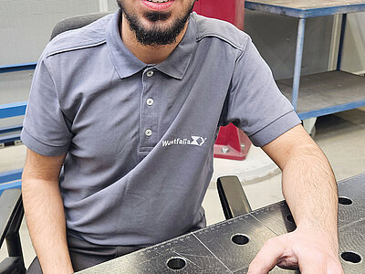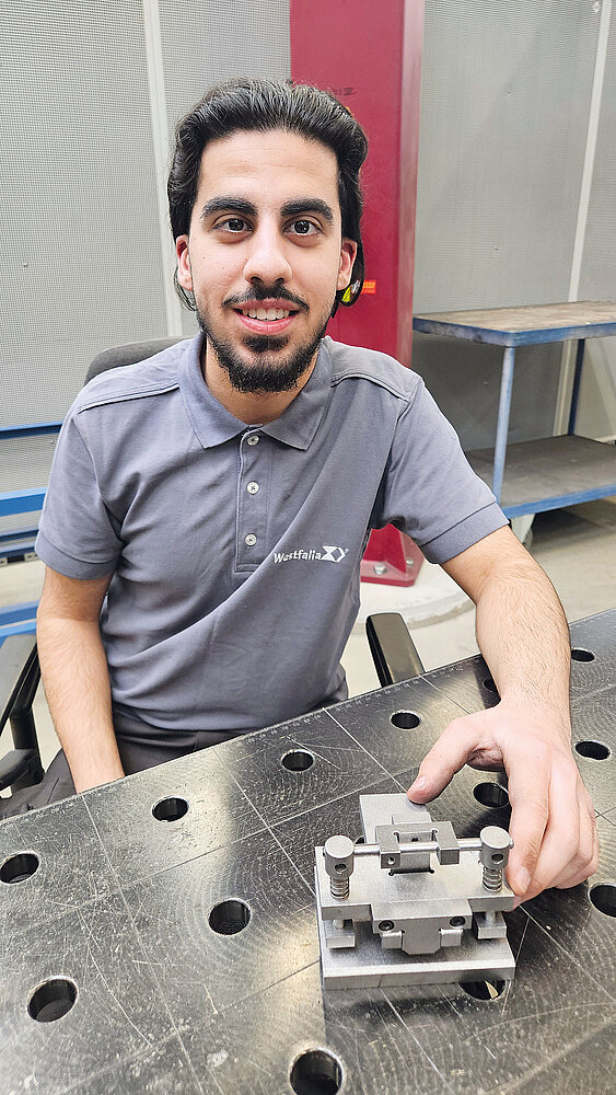 Als Konstruktionsmechaniker hat auch Sindar bei Westfalia gefunden, was er sich gewünscht hat. „Handwerklich und mit Maschinen zu arbeiten, habe ich immer schon geliebt!“, erzählt der Bielefelder. Im Trainingszentrum des Ausbildungsnetzwerks BANG kommt er mit den Aufgaben des Konstruktionsmechanikers wie dem Drehen, Fräsen, Schweißen, Feilen, Sägen, Anreißen, Gewinde schneiden etc. in Berührung und lernt das Ausbildungsangebot bei Westfalia kennen. Beides passt, und der Azubi startet mit einem dreimonatigen Grundlehrgang bei BANG in seinen Traumjob. Eines der Übungsprojekte: ein selbst gebauter Locher, bei dem die verschiedenen „Basics“ der Ausbildung gelernt und verfeinert werden. „Da muss alles sehr genau passen“, betont Sindar. „Das ist eine gute Vorbereitung auf die Arbeit im Betrieb und natürlich auch schon auf die Prüfungen.“